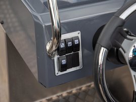 Both driver and co-driver travel in comfort in two fully-padded Offshore boat seats. The windshield is made of glass, which makes installing of a windshield wiper for the driver possible (additional accessory). The two-piece door between the steering consoles is naturally included in the standard package price, as are the two flap seats and middle bench in the stern.