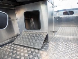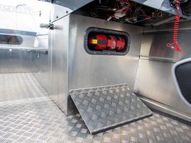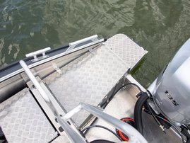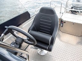 Two fully-padded boat chairs have been placed behind the two steering consoles, which are combined by a two-piece middle door. In addition the stern has been fitted with an aluminium bench and two flap seats. The flap seats together with the central stern bench form a cohesive surface in the aft, that can be used either as seating space or as an additional casting platform.