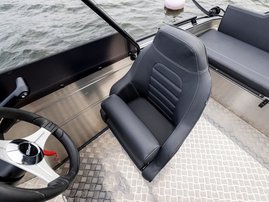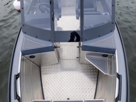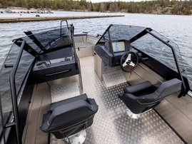 The sister model, Silver Hawk SCX, stands out with its wide side console and single-piece side door, providing enhanced wind protection for the driver and passengers. The side console layout allows for easier movement around the boat, particularly when operating the boat solo, while the centrally positioned driver’s seat ensures optimal balance also when navigating alone. The console provides ample space for multiple chart plotters, displays or additional electronics. Thanks to its spacious front deck, the SCX model is particularly well-suited for active fishing and as a commuter boat.