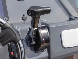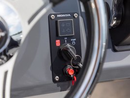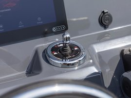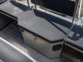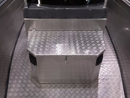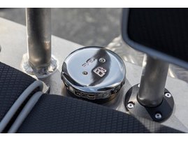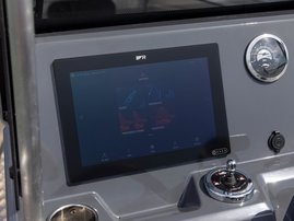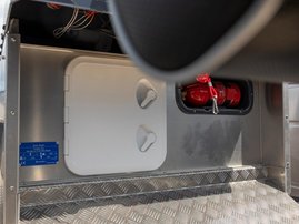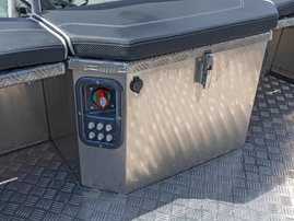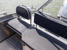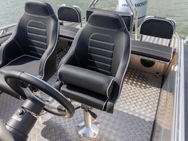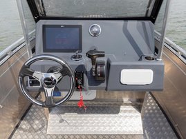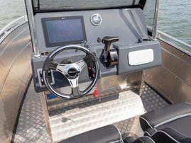 Noticeable features of the Shark CCX are its excellent driving characteristics, silent hull and seaworthiness. The boat's hull, storage units, fixed stern bench and two flap seats in the stern are all made out of robust marine aluminum. Due to ergonomic reasons the steering console is partly made of fiberglass. The wide steering console with its sizeable winshield out of glass provides excellent shelter for both driver and co-pilot. The large instrument panel easily fits even two chartplotters and thanks to the windshield made of glass, the boat can be equipped with a windscreen wiper (additional accessory).