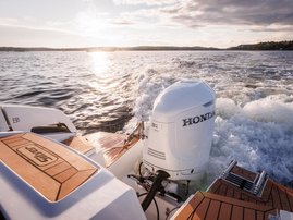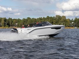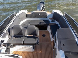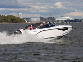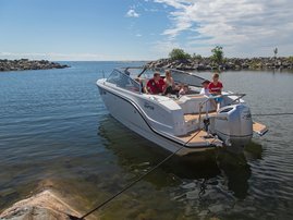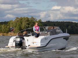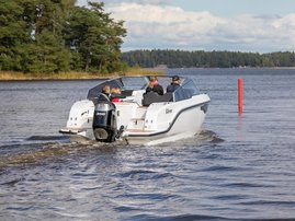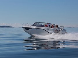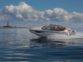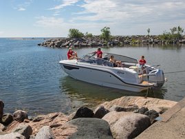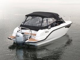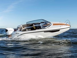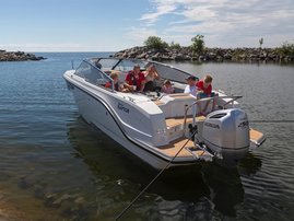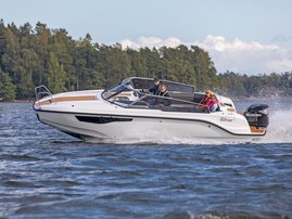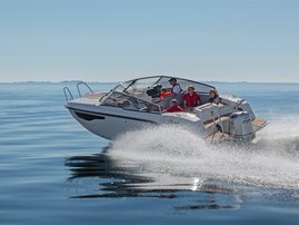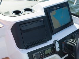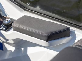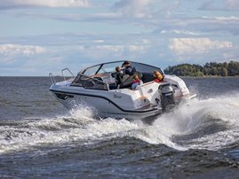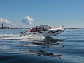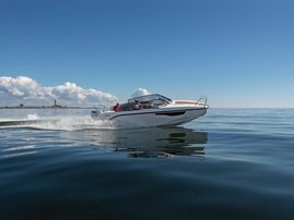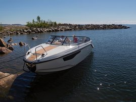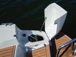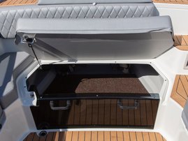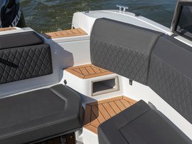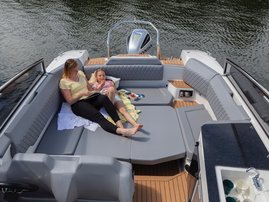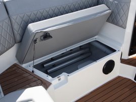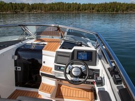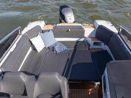 Large storage spaces can be found inside the U-shaped sofa and under the double bed in the cabin, other storage spaces include compartments in the console and pantry, a storage space underneath the driver’s seat and shelves in the cabin. The aft corners have been fitted with decked fender compartments and boxes for mooring lines and anchor. A box for mooring lines is also found in the bow, complete with a foldable boarding ladder.