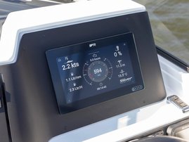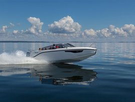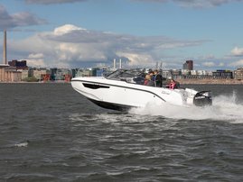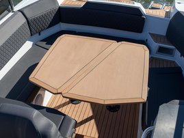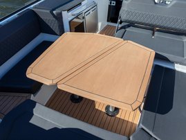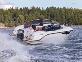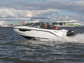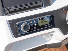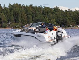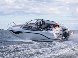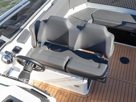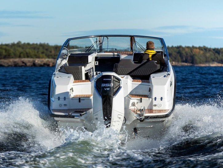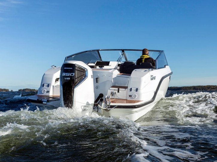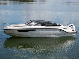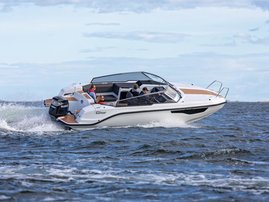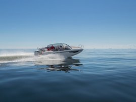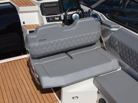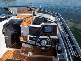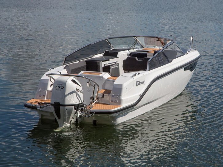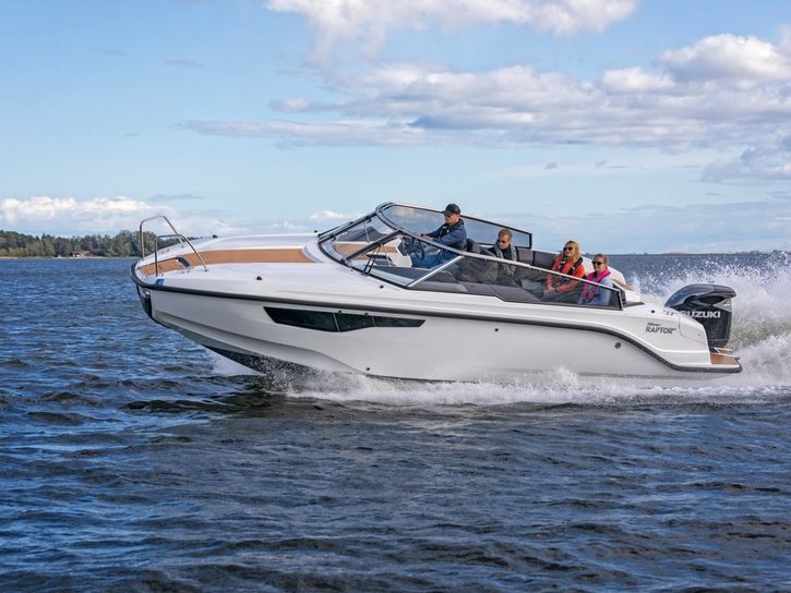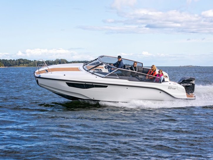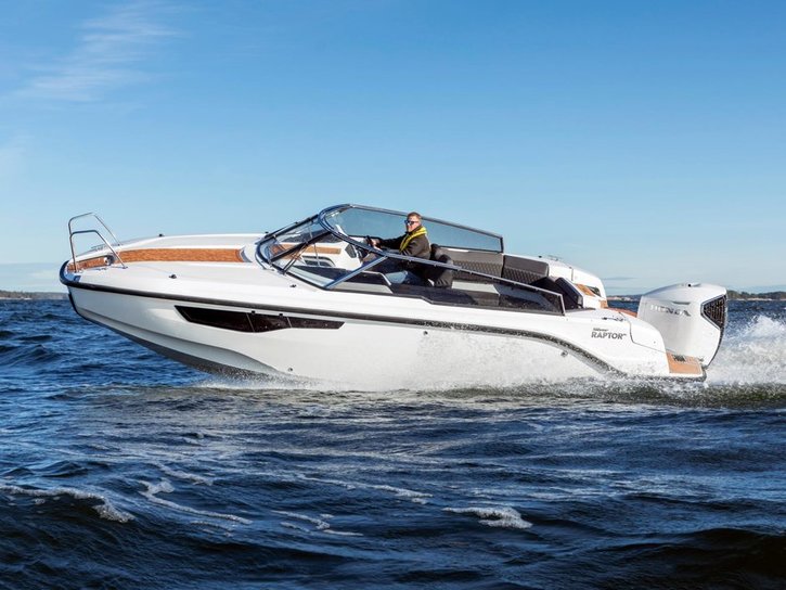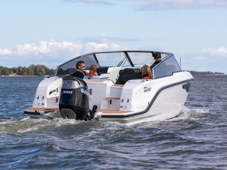 Silver Raptor has a comprehensive standard equipment level, which includes e.g. a 9” Raymarine Axiom+ display (as of YM2021) with a CPT-S transducer sensor, a 260 liter integrated fuel tank, two windscreen wipers, a bow thruster, the cabin’s and stern cockpit’s cushions, the cabins carpet and a composite teak deck in the cockpit, a 3-way stern canopy, a 2-part table for the aft deck, as well as a double-battery system and a pressurized water system. The curtain set, the harbor cover, SeaStar power steering and a heater are examples of additional accessories, which are possible to accquire for an extra cost. Another example from the additional accessory list is a set of integrated solar panels for the bow deck - with the help of the solar panels electricity is ensured for all electric equipment without having to start the engine.
