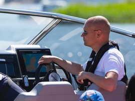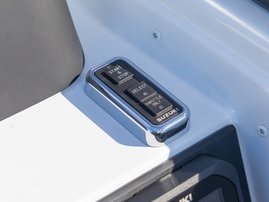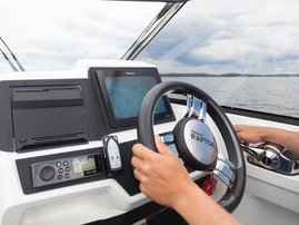 Driving the Silver Raptor is a comfortable yet striking experience. Thanks to the Petestep® hull the interior remains very dry from seasprays at the same time as it makes the boat stable and consistent to drive. The sleek windscreen that continues far along the stern sides gives substantial shelter from airflow for the whole cockpit, and the driver has good visibility in all conditions. The driver’s windscreen has been fitted with an integrated defogging feature. The steering console has been designed not only with style, but especially with ergonomics in mind. The instrument panel includes both a Raymarine Axiom display/chartplotter and space for a separate tablet.