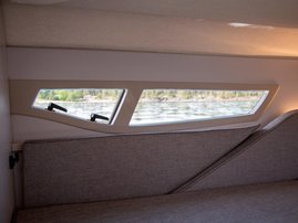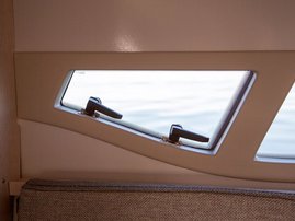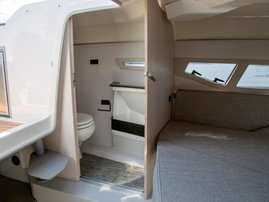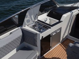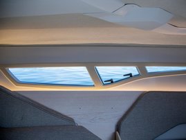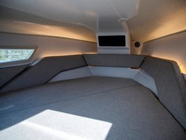As Silver Raptor is a large premium-class Day Cruiser, berths for several people as well as plenty of storage space is more of an expectation than a desire. The cabin sleeps four and the sunbed in the stern doubles as a bed for two adults. The inside of the 3-way stern canopy can be fitted with separate blackout curtains - this way the persons sleeping in the stern enjoy some privacy. The curtain set comes with a drop curtain, which restricts visibility from the cabin to the stern and vice versa.