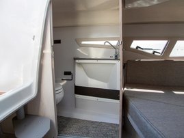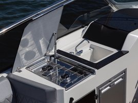 Travel comfort is increased by the pantry found on the port side, complete with a gas stove, wash basin and countertop space, as well as by the closed-off sea water toilet in the cabin. A double-battery system ensures power supply.