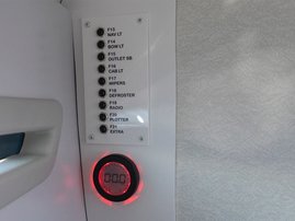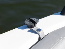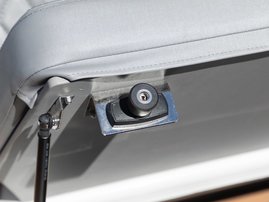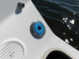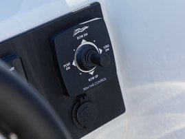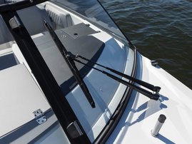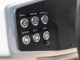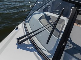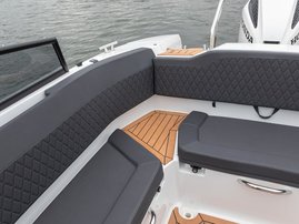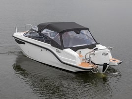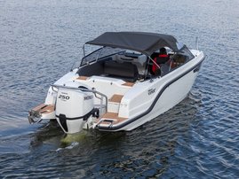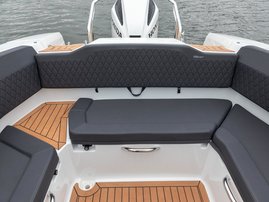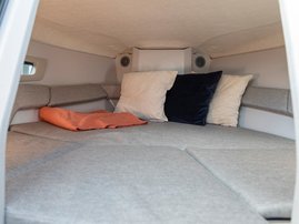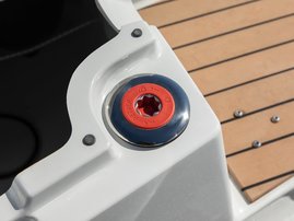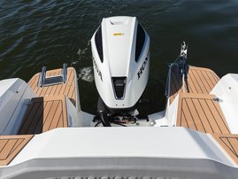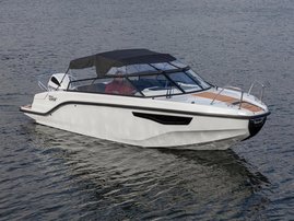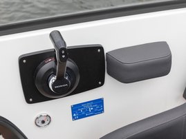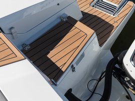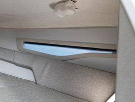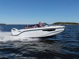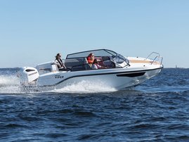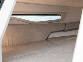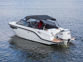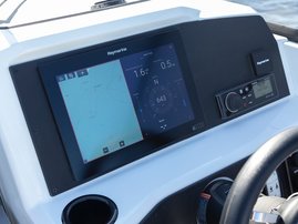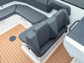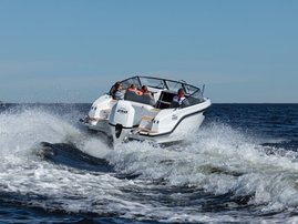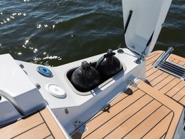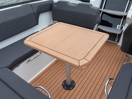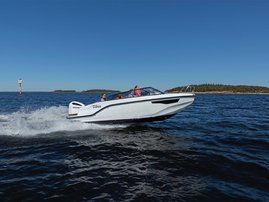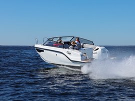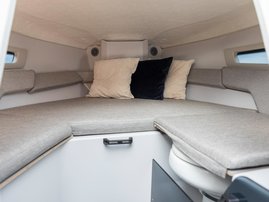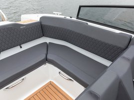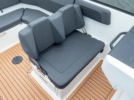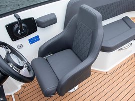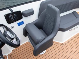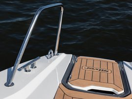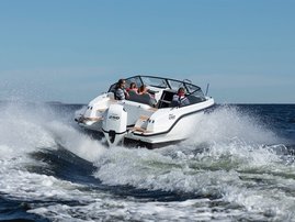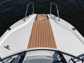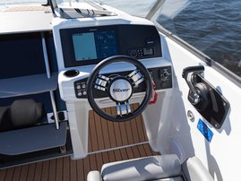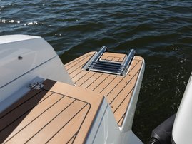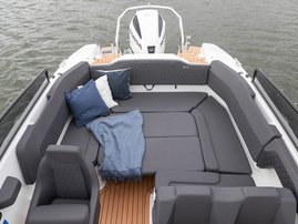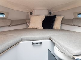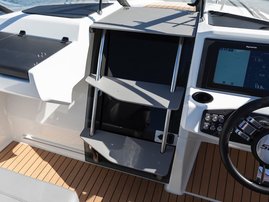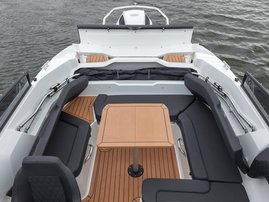 The sleek windscreen that continues along the sides gives substantial shelter from airflow for the whole cockpit. To make the driving even more convenient the boat has hydraulic steering and a 9" Raymarine Axiom+ chartplotter as standard. All the gauges and switches are located well in the driver’s field of vision and are easy to maneuver. A foldable ladder in the bow enable easier embarking. There is also space for a bow thruster and a smart LED-spotlight in the very bow. The spotlight makes boating in the dark safer and easier.