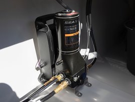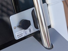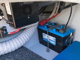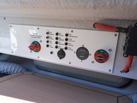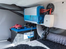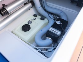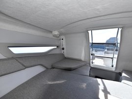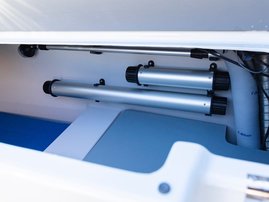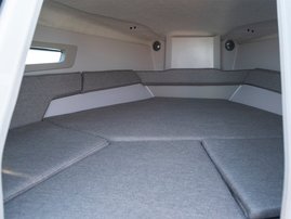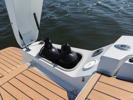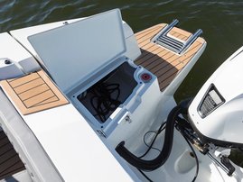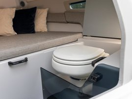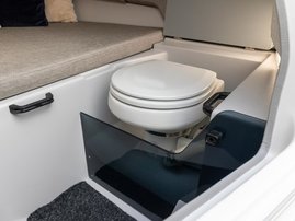 The spacious bow cabin is equipped with an electric water toilet. The pantry on the port side has place for a fridge, gas stove and washbasin (additional accessories). The large storage compartments under the u-sofa in the stern are lockable by solid Abloy locks, which means you can safely leave your belongings in the boat even for longer periods of time.