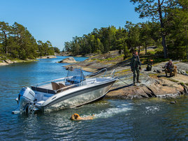 Skrovet och interiören innehåller inget sönderfallande eller vätande material. Tack vare aluminiumskrovet kan du ta iland vid en naturlig hamnklippa eller sandstrand utan att behöva oroa dig för skråmor.