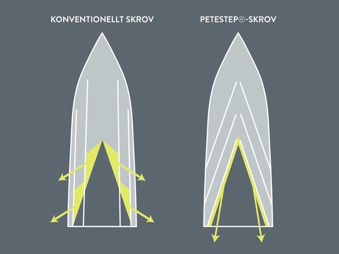 Petestep®-skrovets hemlighet döljer sig i ’stegen’ på skrovets botten. Dessa Petestep®-steg leder vattenmassan ner och bak, vilket ger båten mer lyft och framåtriktad kraft. Våtytan är mindre hos båtar med Petestep®-skrov än hos båtar med konventionella v-skrov, som i allmänhet har steglister som går i längsriktning. Tack vare den mindre våtytan och vattenmassan som styrs ner och bak har Petestep®-skroven ett förminskat vattenmotstånd, båtarna går högre i vattnet och på så sätt är behovet av energi mindre.