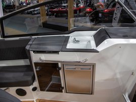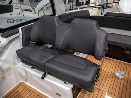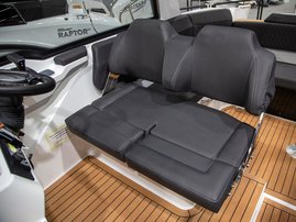 Weekender-tyylisessä Raptor ST -mallissa löytyy mm. makuupaikat neljälle aikuiselle, mukavat seurustelutilat veneen taka-osassa tilavalla ja muhkealla u-sohvalla, pentteri kaasuliedellä, tiskialtaalla ja laskutilalla, sekä kajuutassa ovellinen vesi-WC. Kaksoisakkujärjestelmä varmistaa virran saannin. Säilytystiloja veneessä on runsaasti, jolloin laukut ja muut tykötarpeet saa pois jaloista pyörimästä, kun veneessä vietetään laatuaikaa perheen tai ystävien kera. Vene on kattavasti vakiovarusteltu, mutta myös lisävarustevalikoima on laaja, joten se on helposti räätälöitävissä juuri omiin tarpeisiin sopivaksi.