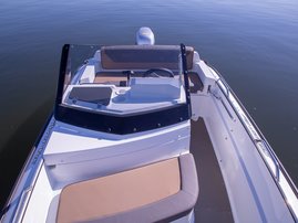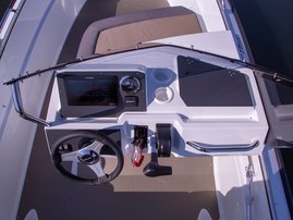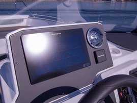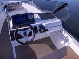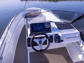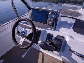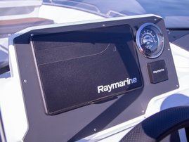 Fox Avant er blitt utrustet med en bred sidekonsoll, som er plassert på styrbord side. Sjåføren har inget frittstående sete uten styrer båten fra akterbenk, men vi har lagt stor vekt på å gjøre kjøreergonomien og passasjerkomforten så god som mulig. Den brede frontruten gir bra beskyttelse fra vind og sjøsprøyt, og i konsollen er der oppbervaringsplass for småting. En 9 tommers Raymarine Axiom -multifunksjonsskjerm med kartplotter og ekkolodd inkluderes som standard for Fox Avant fra og med modellår 2018. Raymarine Axiom gjør navigasjon enklere og viser all nødvendig informasjon fra påhengsmotoren til sjåføren. Skjermen er blitt installert på instrumentpanelet slik at den er i sjåførens synsfelt, men uten å skjule visningen fremover.