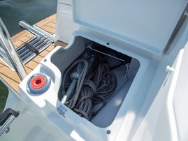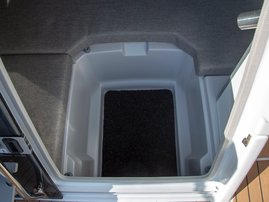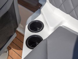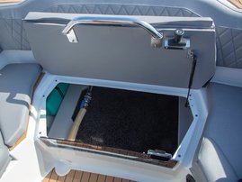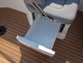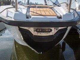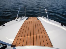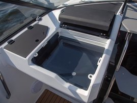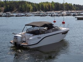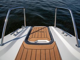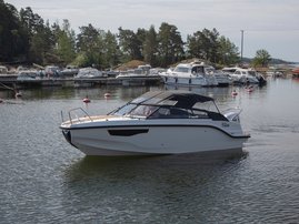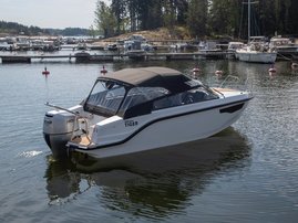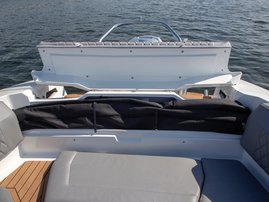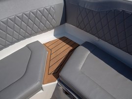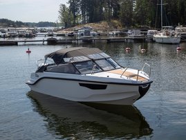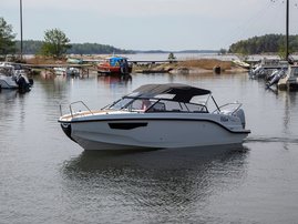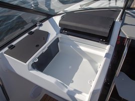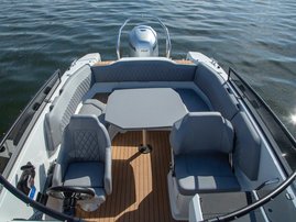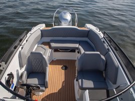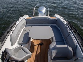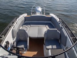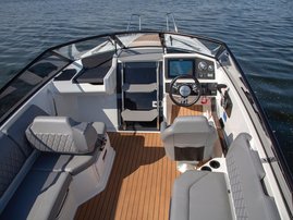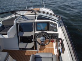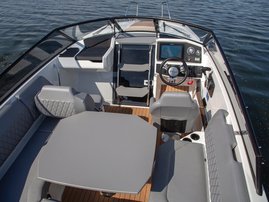 Kjørekomforten er veldig god og førerplassen er blitt designet med ergonomi, stil og håndterlighed i tankene. Sjåføren har alle kontroller og målere samt Raymarine Axiom 9"-kartplotteren lett håndterbare på instrumentpanelen. Båten er lett å styre både enten du vil sitte eller stå og kjøre båten. På akterdekket kan enkelt monteres et bord, som også nyttes til solseng. Frontruten gir bra beskyttelse fra vind og sjøsprøyt, men avvikende fra bildene her er frontrutens ramme sort - noe som passer godt ihop med båtens andre sorte detaljer.