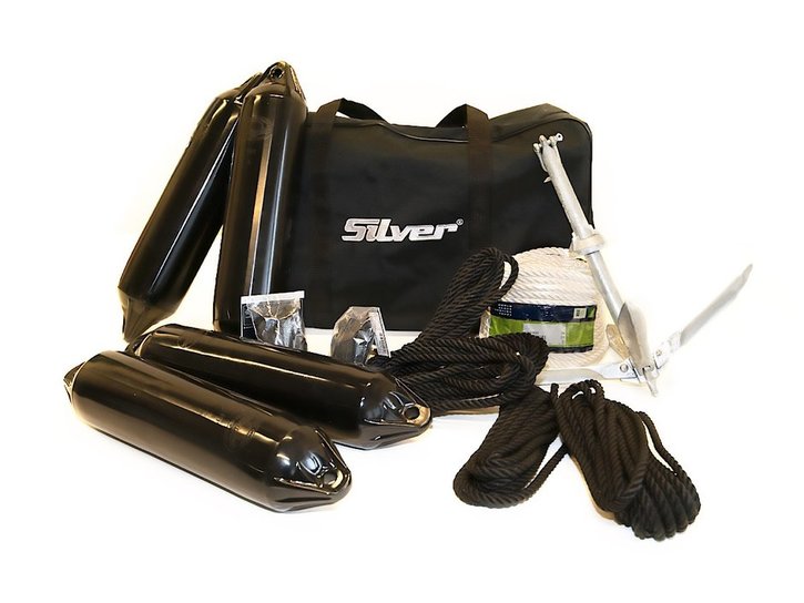 Den hållbara Silver-utrustningsväskan innehåller 4 st. förtöjningsrep (12 mm/7 m), ett ankarrep (12 mm/30 m), 4 st. fendrar, 4 st. rep för fendrar samt en 5,5 kg:s draggankare (grapnel).