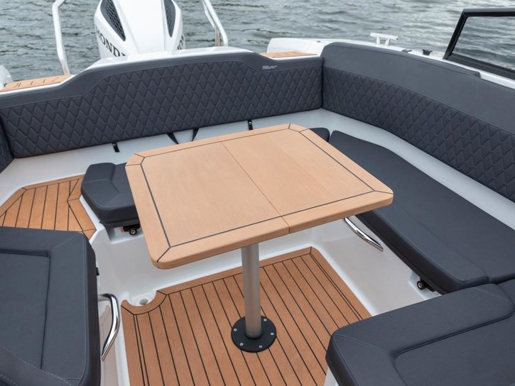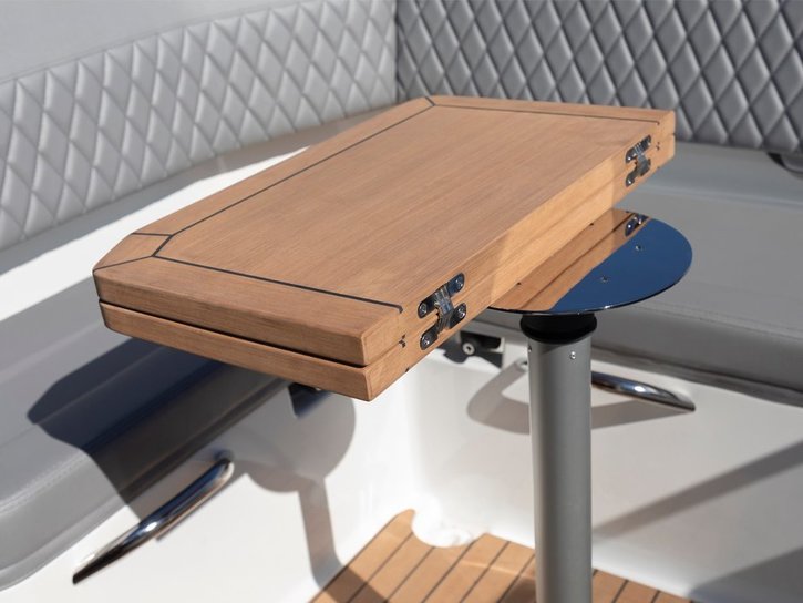 Takatilaan asennettava pöytä jalalla ja irtonaisella aurinkopatjalla, jolla lisäät käyttömukavuutta kesäsäällä.
